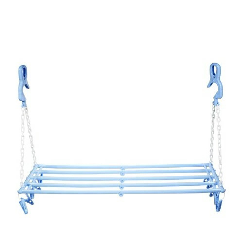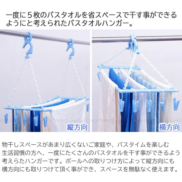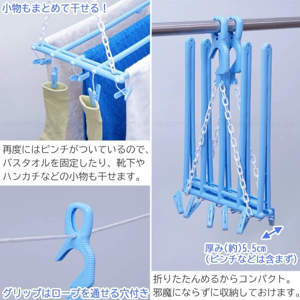 少ないスペースでバスタオルが5枚干せます。ピンチ10個付でタオルを止めたり靴下などの小物干しに。物干し竿に対して2通りの方向で使えスペース有効活用。使わない時はコンパクトに収納。