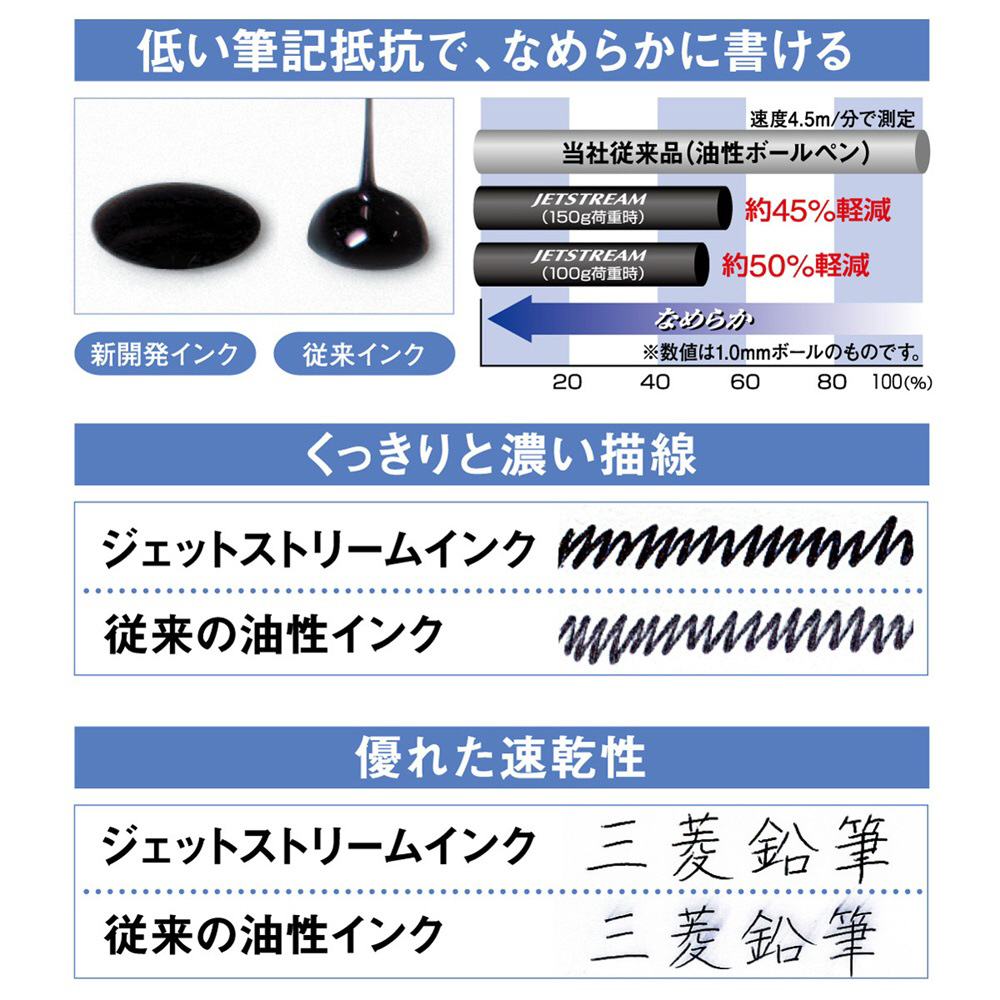 「クセになる、なめらかな書き味。」を実現した、世界初の画期的な新開発インクを搭載し、既存の油性ボールペンと比較して、『JETSTREAM』は筆記速度に関わらず、低い筆記抵抗でなめらかな書き味を実現しました。