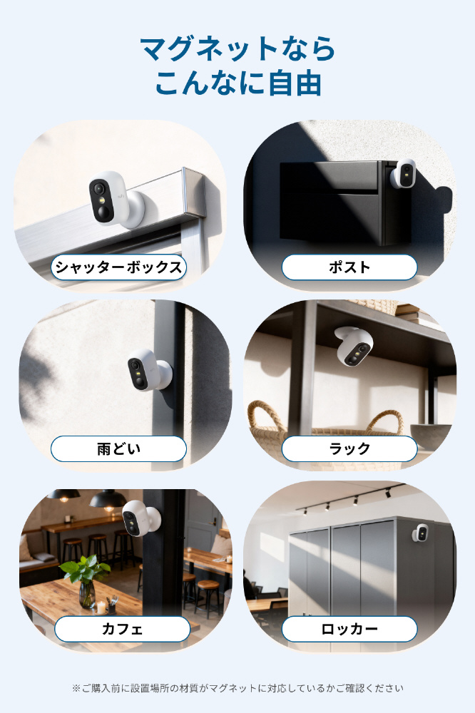 マグネットなら屋外・屋内問わずどんな場所でも簡単に設置でき、手軽に防犯対策ができます。取付金具での固定※、壁への取り付け、直置きなど様々な設置方法があります。※取付金具は別売りです