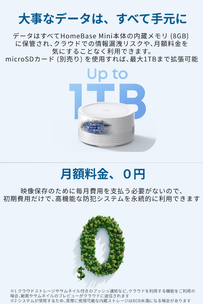 データはすべてHomeBase Mini本体の内蔵メモリ (8GB) に保管され、クラウドでの情報漏洩リスクや、月額料金を気にすることなく利用できます。microSDカード (別売り) を使用すれば、最大1TBまで拡張可能。