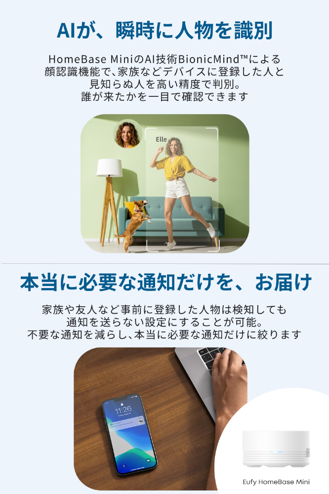 HomeBase Miniの顔認識AI技術BionicMind?により、家族などデバイスに登録した人と見知らぬ人を高い精度で判別。誰が来たかを一目で確認できます。