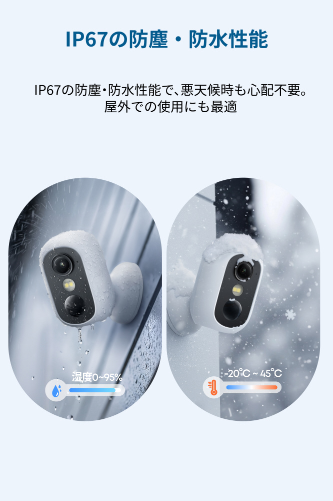 IP67の防塵・防水性能で、雨やほこりの多い環境、悪天候時でも心配不要。