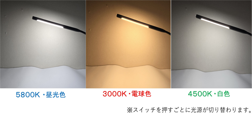 ●電源スイッチを押す度に光源色が切り替わります。 5800k ⇒ 3000k ⇒ 4500k ⇒ OFF