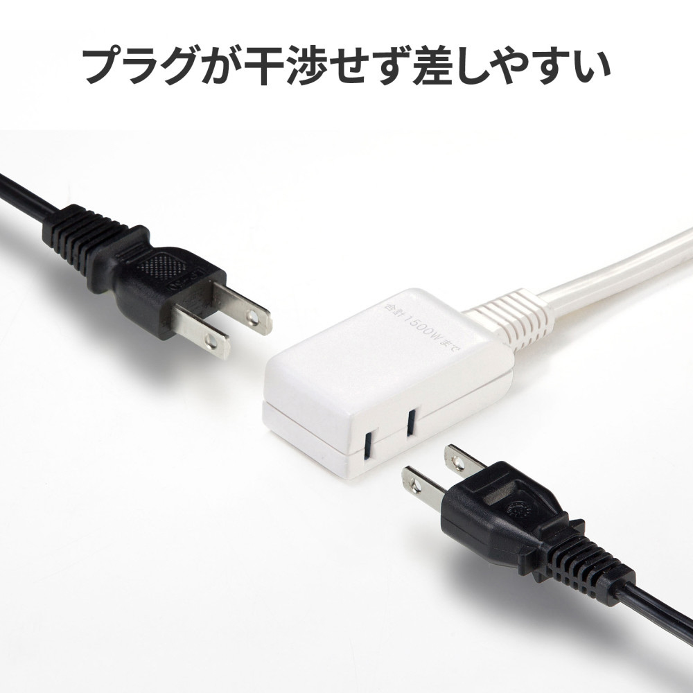 ●プラグが干渉せず差しやすい2個口仕様 タップの上面・側面に差込口がレイアウトされており、プラグが互いに干渉しにくいので、無駄なく差すことができます。