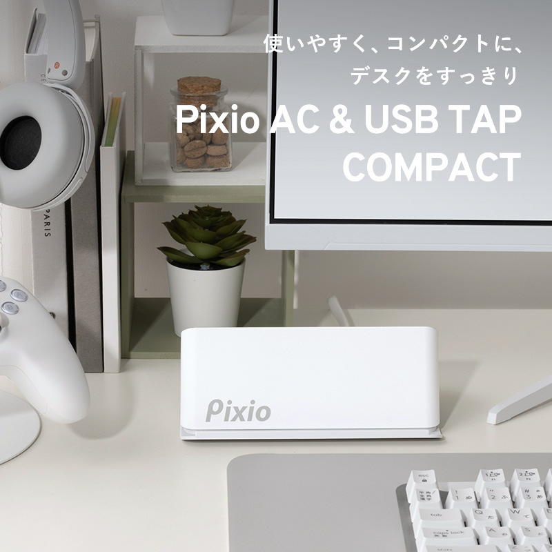 ケーブルだらけでごちゃごちゃしたデスク周りを、すっきり使いやすく。Pixio AC&USB Tap compactは、複数のデジタルデバイスを一括チャージできる充電ステーションです。