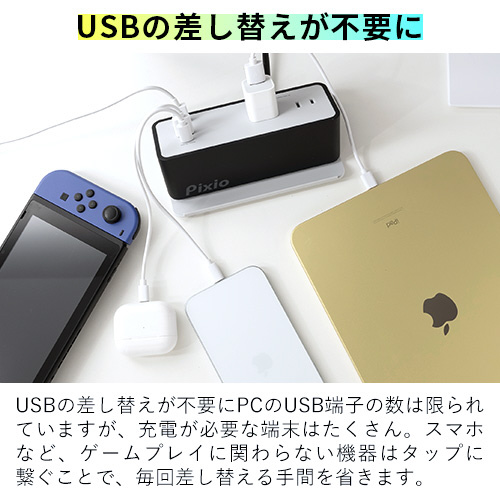 USBの差し替えが不要にPCのUSB端子の数は限られていますが、充電が必要な端末はたくさん。 スマホなど、ゲームプレイに関わらない機器はタップに繋ぐことで、毎回差し替える手間を省きます。