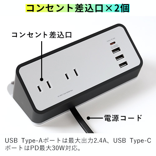 USB Type-Aポートは最大出力2.4A、USB Type-CポートはPD最大30W対応。