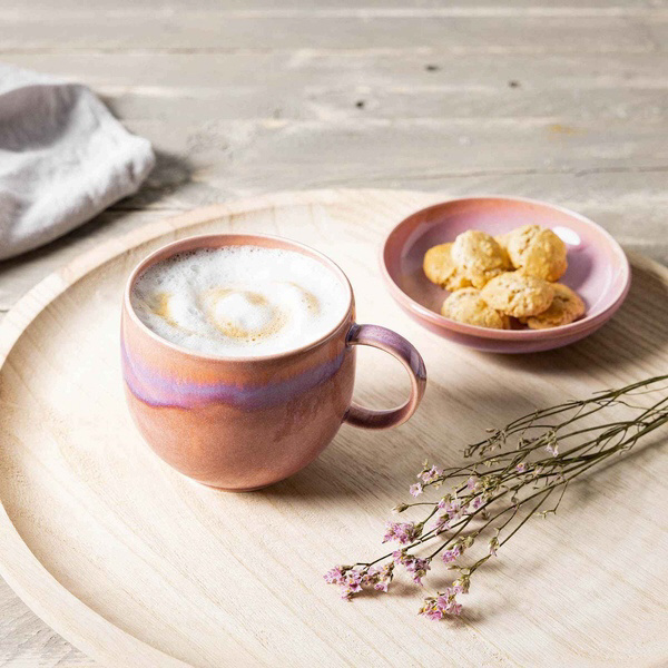心地よい色彩バリエーションの中でほのかにきらめく独特の仕上がりを見せる特徴的な釉薬効果が、ユニークでモダンな表情を与えています。