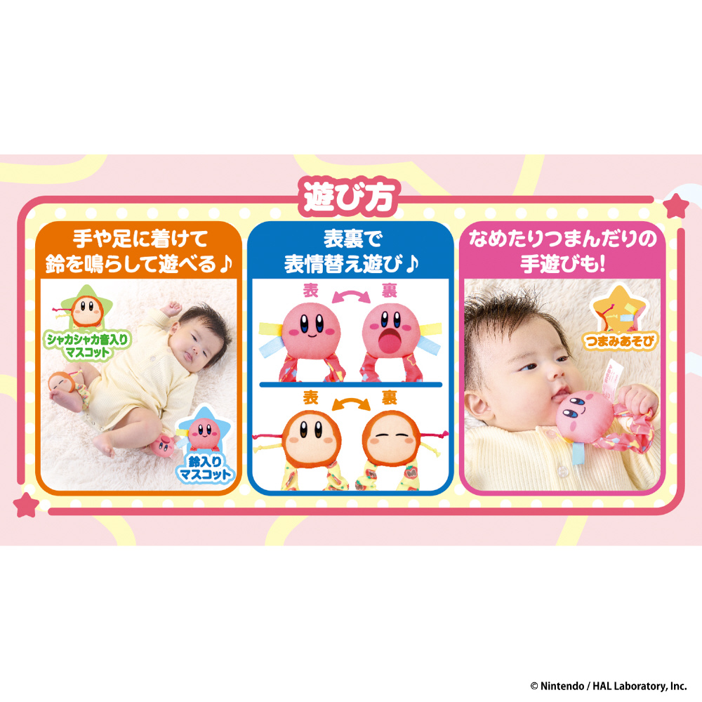 リンリン鈴入りのカービィとシャカシャカ鈴が楽しいワドルディの2個入りで、手や足につけ音を鳴らして遊ぶ布製ラトルです。