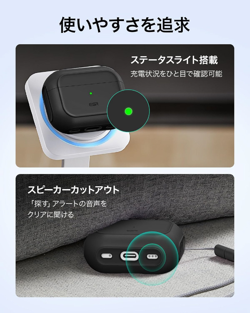 【スピーカーカットアウト】:底部に配置された特別な開口部により、「探す」アプリの音声アラートをクリアに聞くことができ、イヤホンを位置を確実に把握できます。