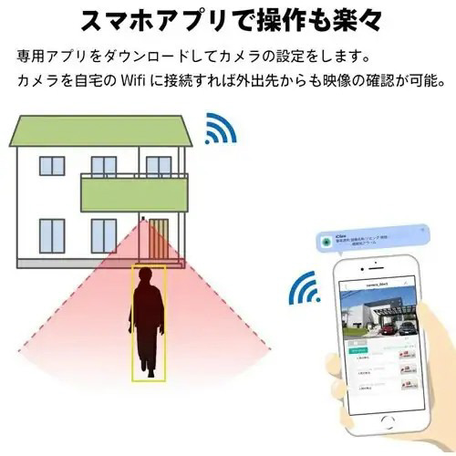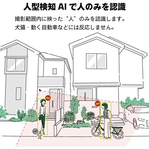 AIで人物のみ検知する防犯カメラです。犬や猫、揺れる木や動く車には反応せず、人物に反応して警報通知をお手持ちのスマホに送れます。画像認識AIで「人」を自動追尾して不審者を逃しません。