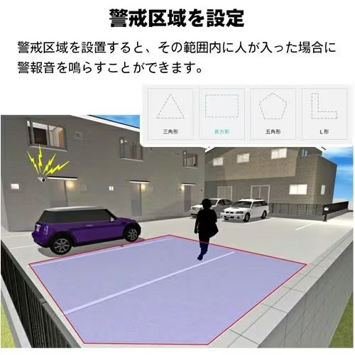 アプリにて撮影場所の警戒区域を設定すると指定した範囲内に人が侵入するとカメラから警戒音を鳴らすことができます。警戒区域はお好みの大きさや形に設定できるのでご自宅や駐車場の大きさに合わせられて大変便利です。