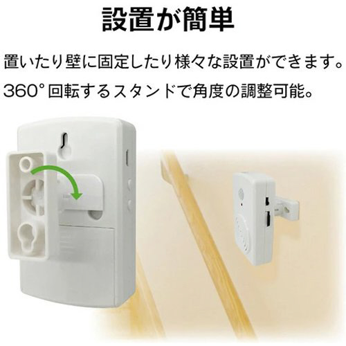 センサー範囲内で人を検知すると、警報ライトと共に選択中の音声を再生します。