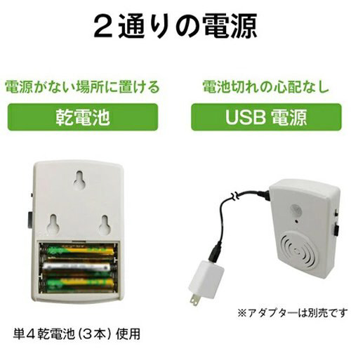 太陽光またはUSB充電式。電源のない場所でも設置ができます。