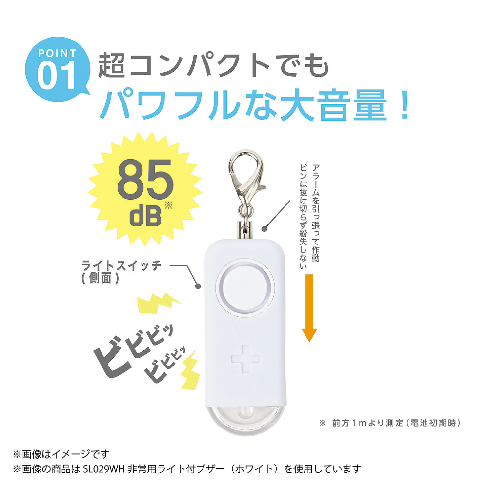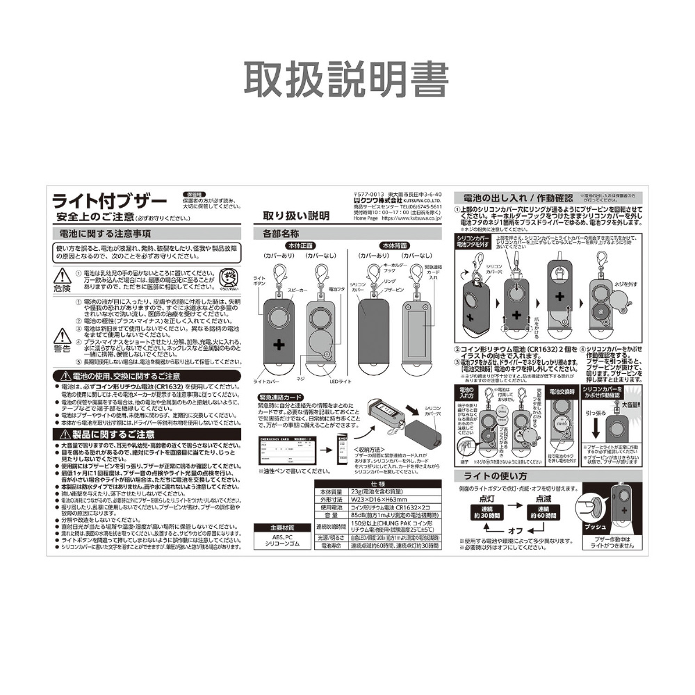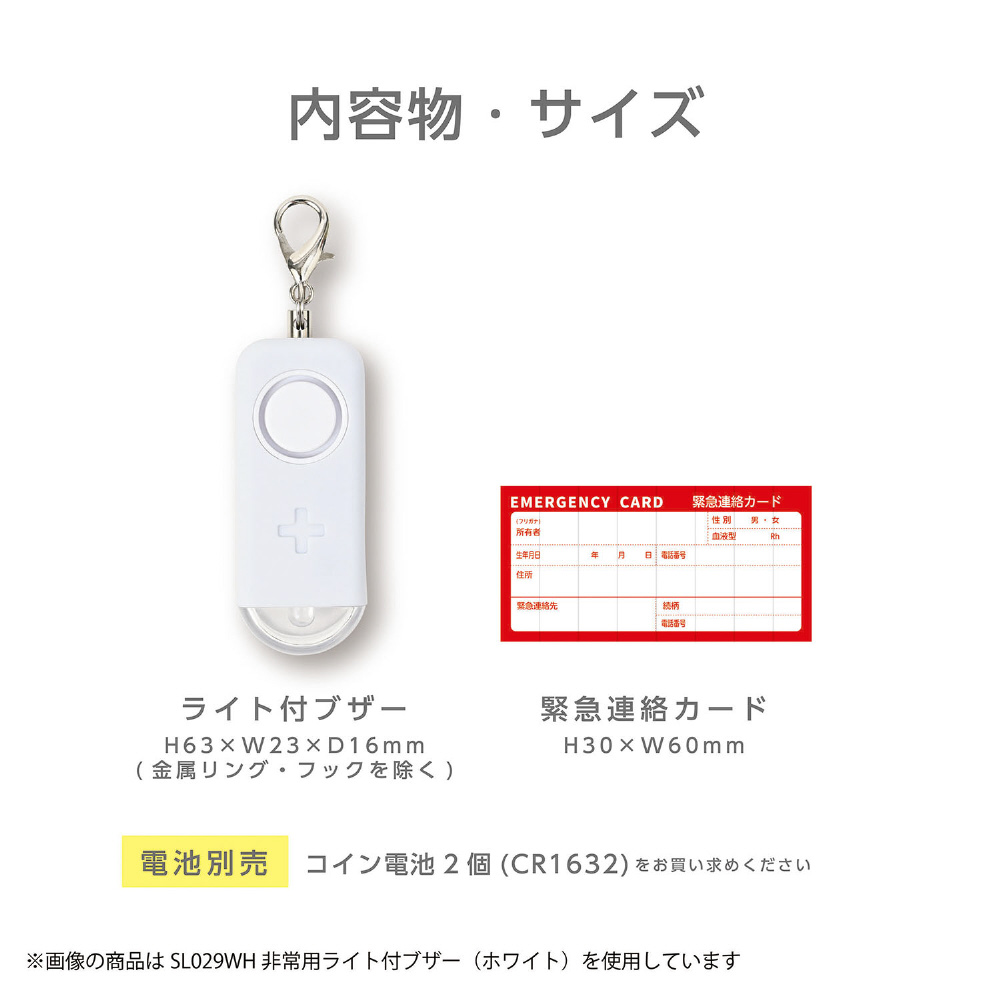 ・超コンパクトで大音量85db以上 ・明るい2段階のLEDライト(点灯と点滅) ・書いて消せるメモ欄、緊急連絡カード付 ・シリコンと樹脂のW構造で丈夫 ・CR1632コイン型リチウム電池2個使用(別売) ※アラーム使用時はLEDは同時に点灯しません