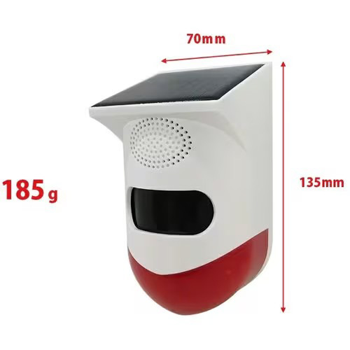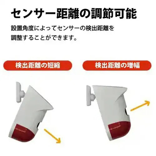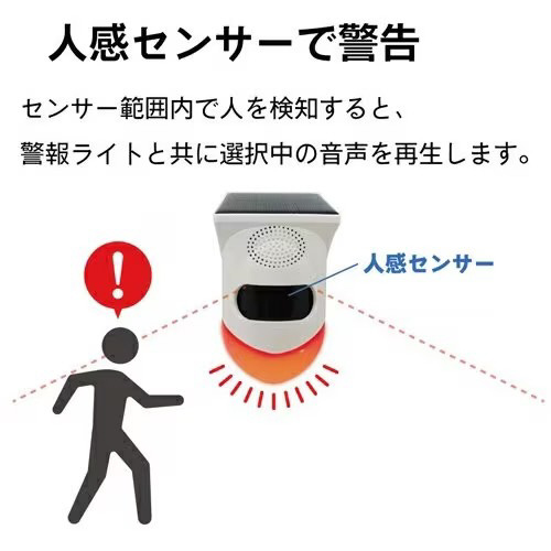 センサー範囲内で人を検知すると、警報ライトと共に選択中の音声を再生します。