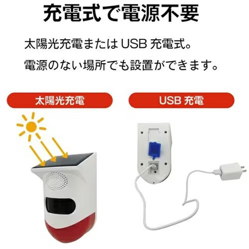 太陽光またはUSB充電式。電源のない場所でも設置ができます。