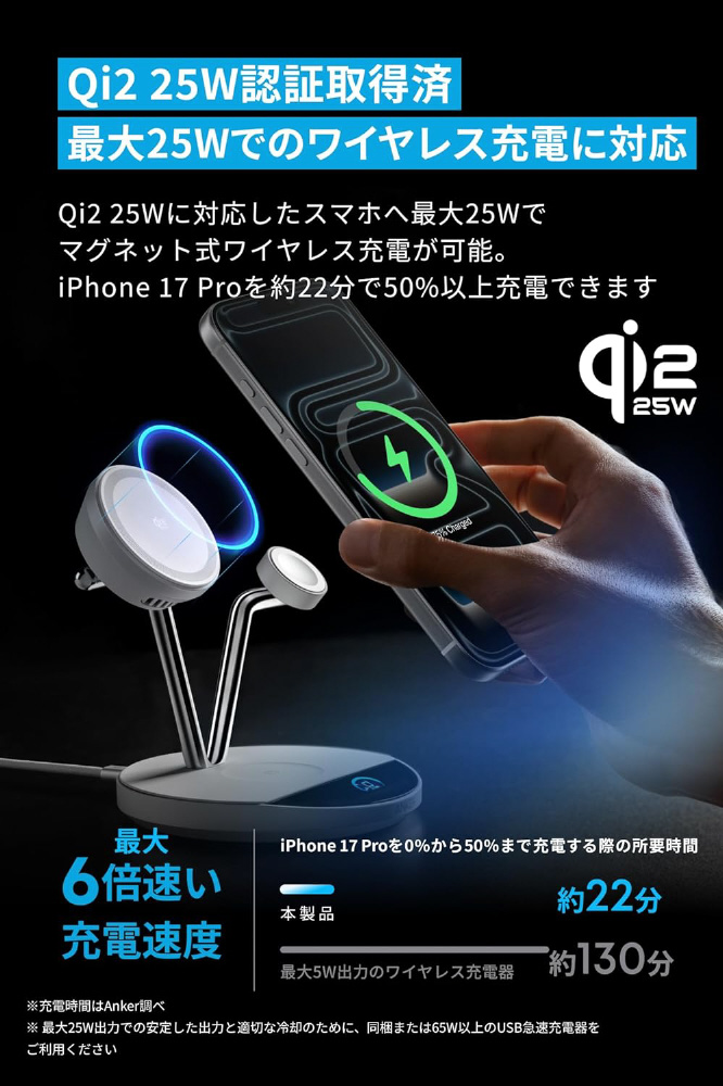 Qi2 25Wに対応したスマホへ最大25Wでマグネット式ワイヤレス充電が可能。 iPhone 17 Proを約22分で50%以上充電できます