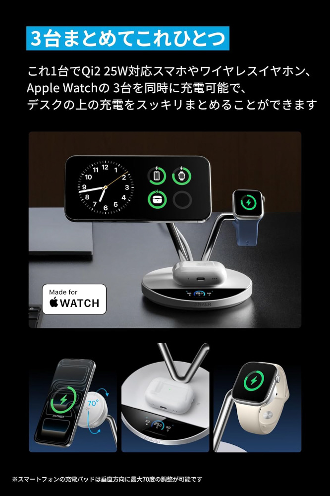 これ1台でQi2 25W対応スマホやワイヤレスイヤホン、Apple Watchの 3台を同時に充電可能で、デスクの上の充電をスッキリまとめることができます