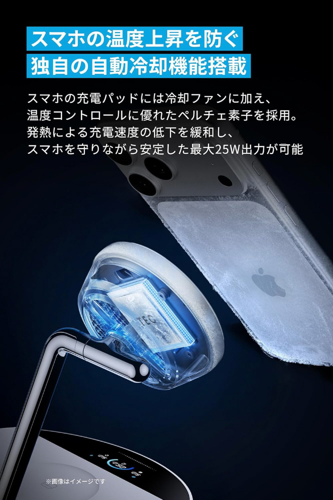 スマホの充電パッドには冷却ファンに加え、温度コントロールに優れたペルチェ素子を採用。発熱による充電速度の低下を緩和し、スマホを守りながら安定した最大25W出力が可能
