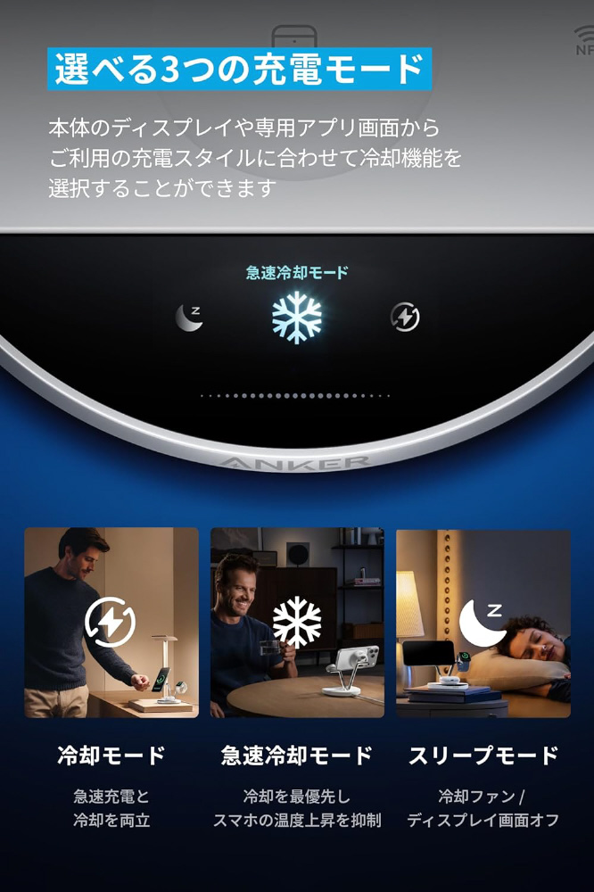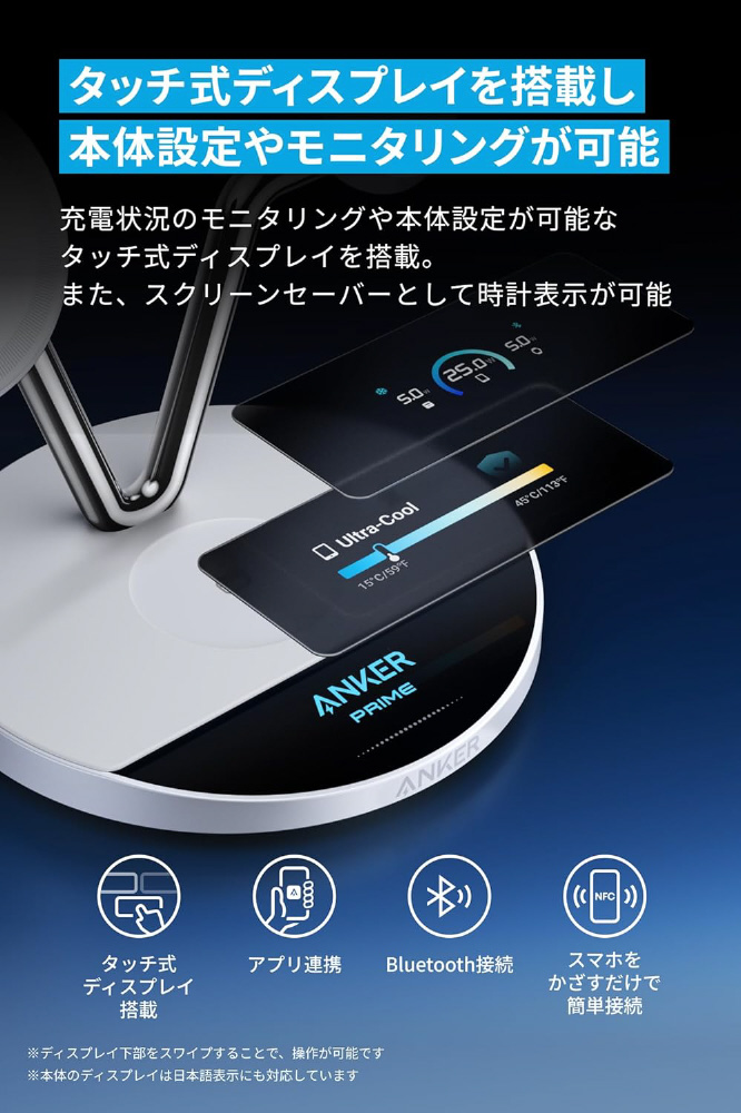 本体のディスプレイや専用アプリ画面からご利用の充電スタイルに合わせて冷却機能を選択することができます