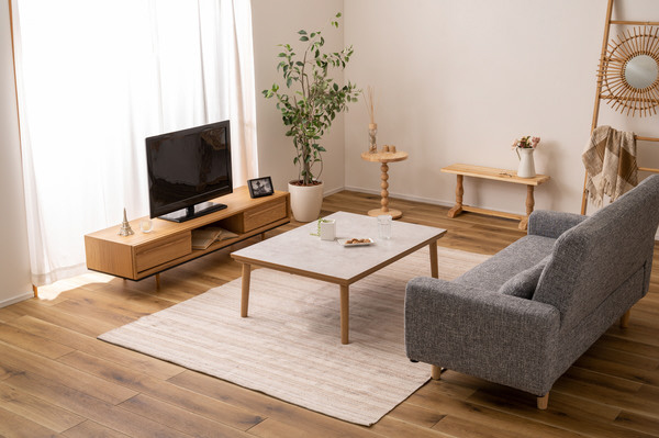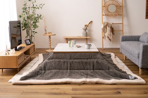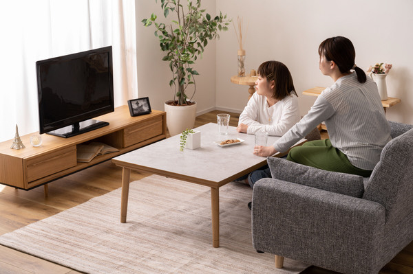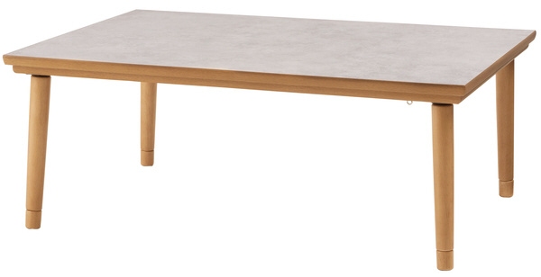 大理石調のストーン柄の天板とナチュラルな木目の組み合わせたフラットヒーターコタツ。