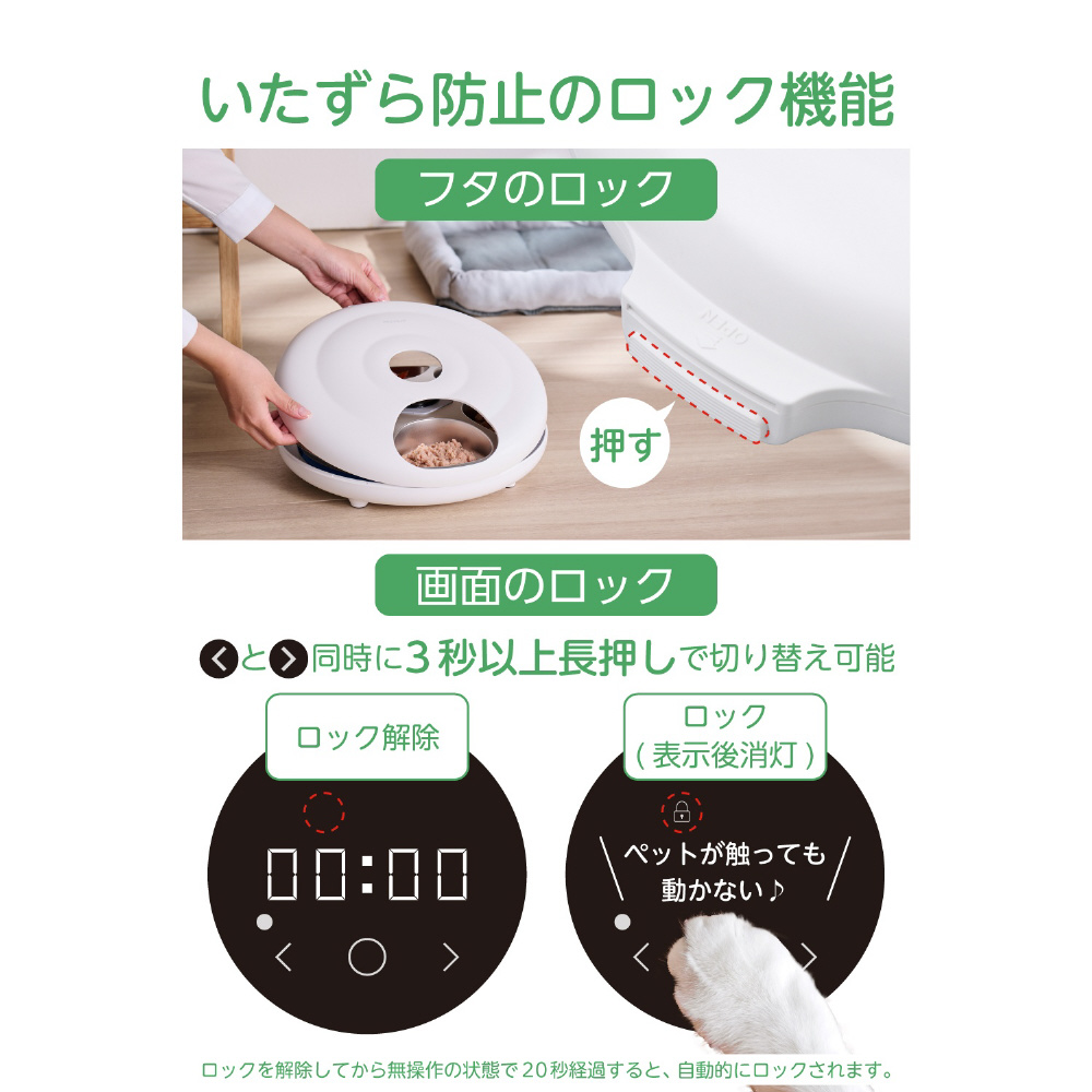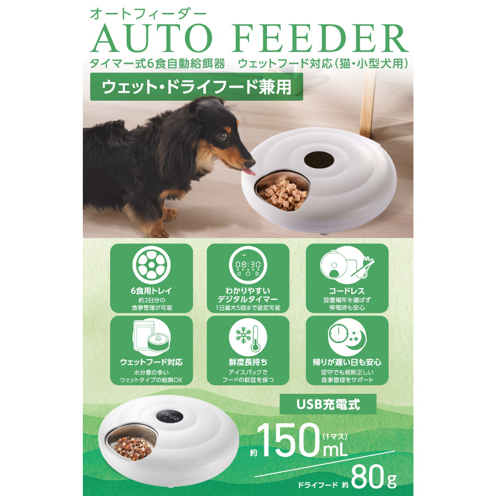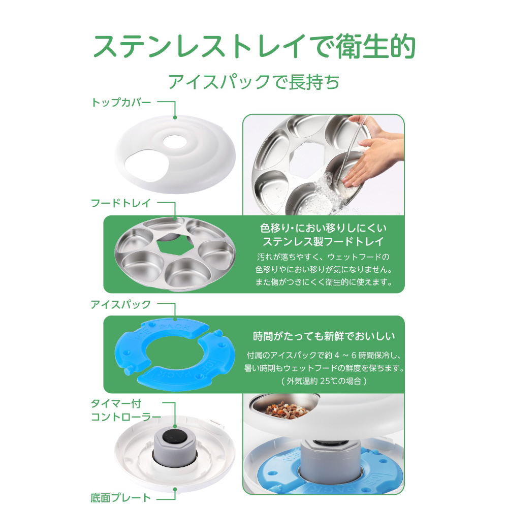 自動給餌器 猫 犬 ウェット対応 6食 タイマー5分単位 24時間リピート 保冷アイスパック 食洗機対応 ステンレストレイ 充電式コードレス 約6カ月 ホワイト