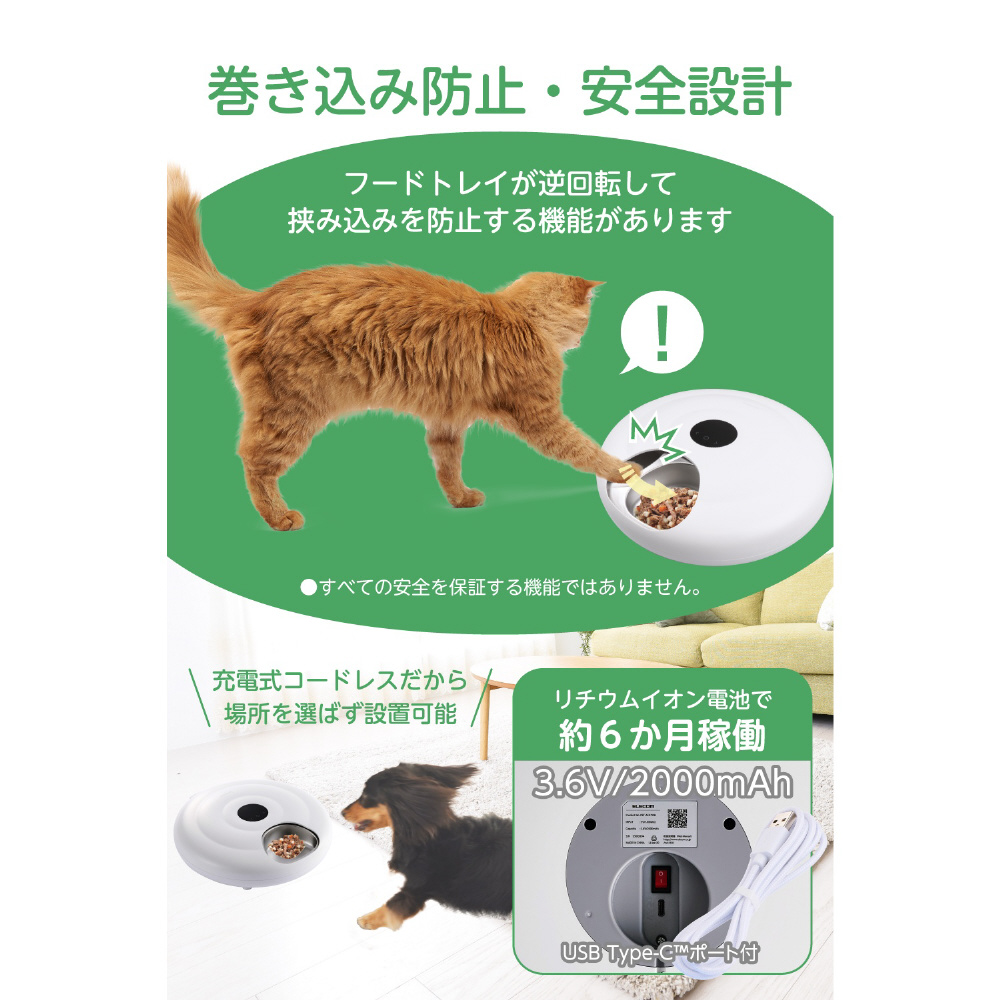 タイマーは5分単位で設定でき、最大5回給餌が可能。24時間サイクルで繰り返すので、毎日の食事管理も安心です。