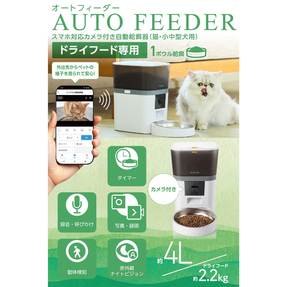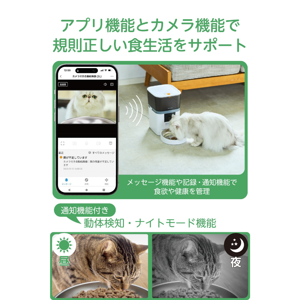 飼い主の留守中も見守れて安心!スマホアプリからリアルタイムで、愛犬・愛猫の様子を確認できるカメラ付き自動給餌器です。ごはんの量や回数を細かく設定でき、外出中でも規則正しい食生活をサポートします。約4Lの大容量タンクで、不在が続くときもごはんをたっぷりストックできます。