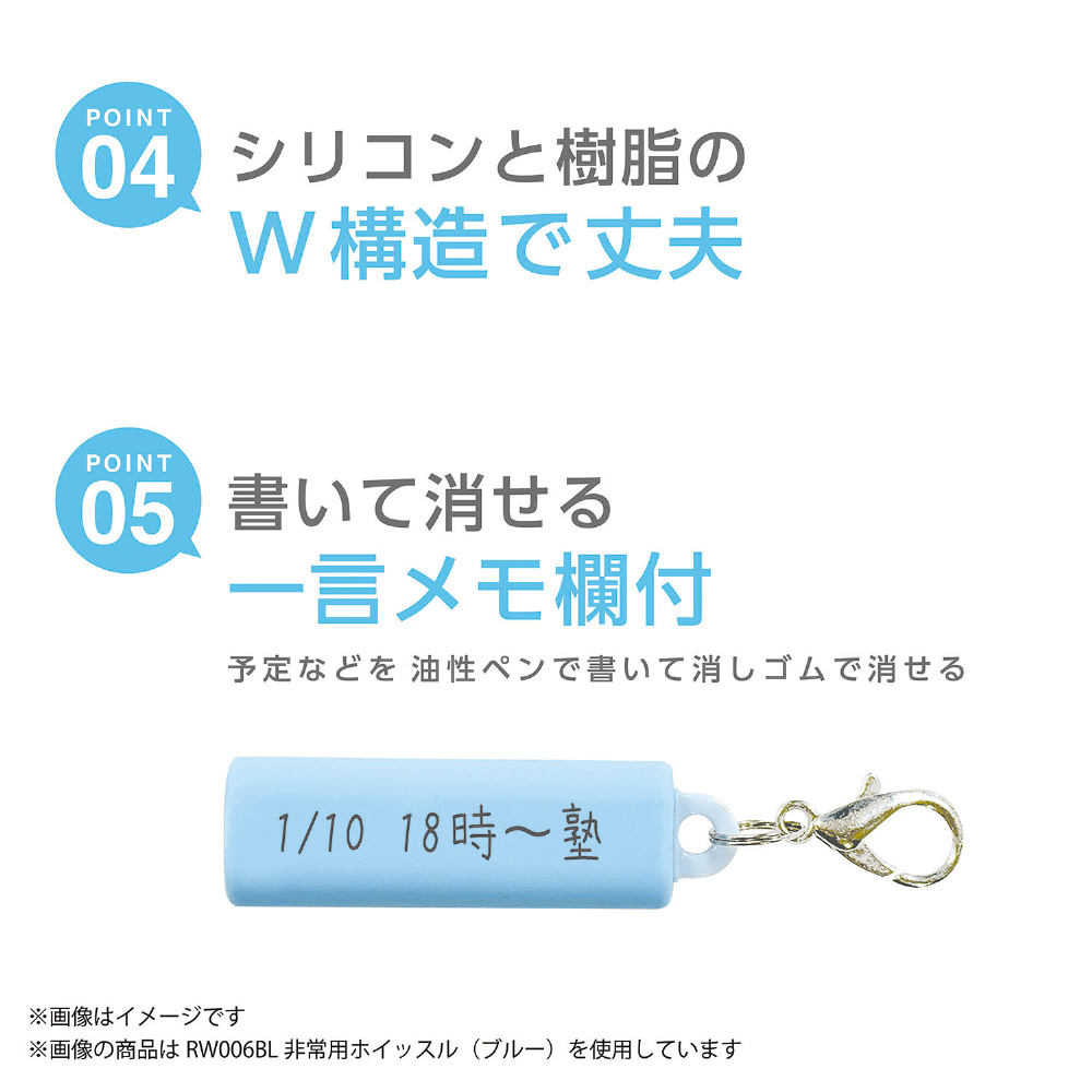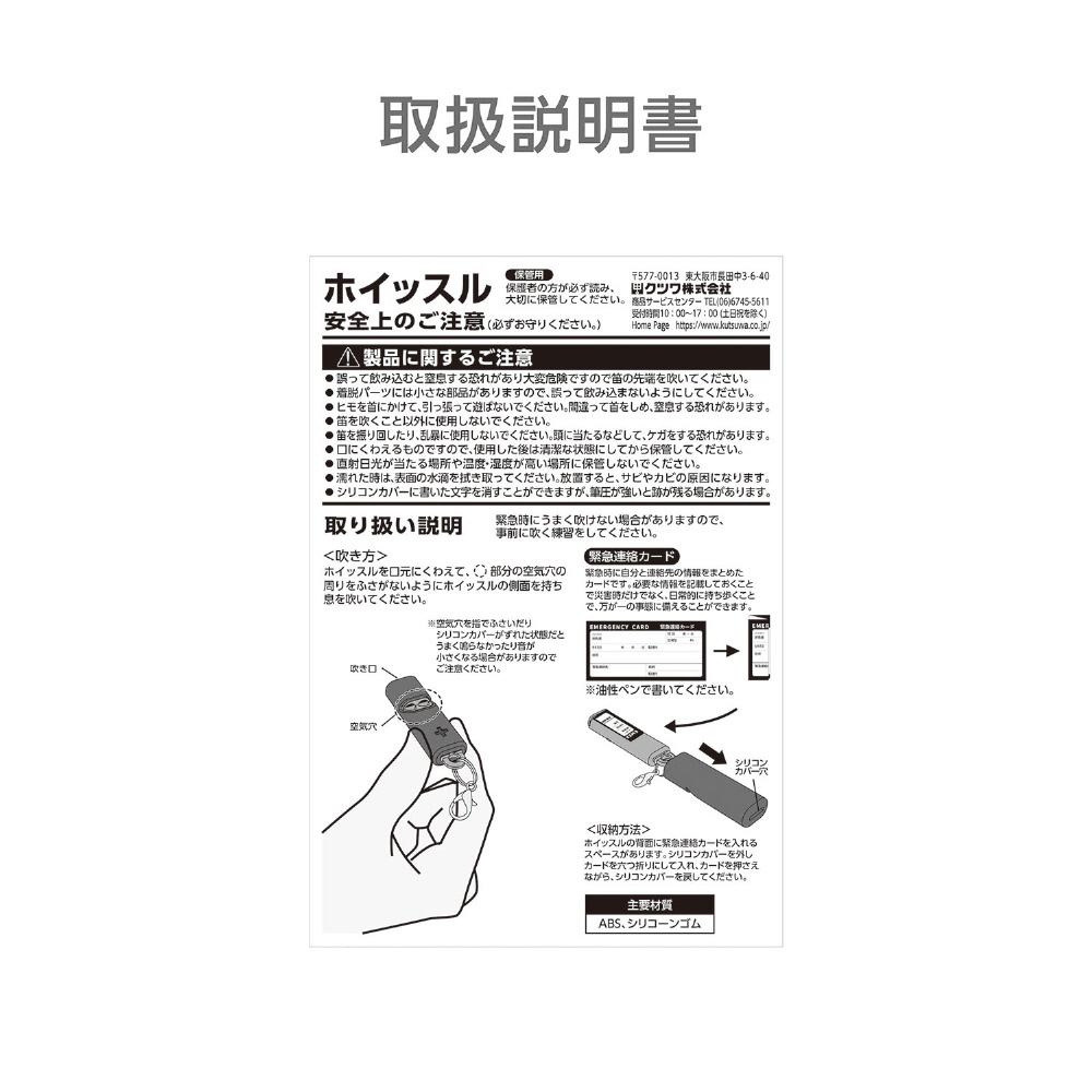 ・超コンパクトでも大音量110dB ・2種類の音で騒音の中でも聞こえやすい ・吹き口がシリコンなので清潔でくわえやすい ・シリコンと樹脂のW構造で丈夫、首掛け紐付 ・書いて消せるメモ欄付、緊急連絡カード付