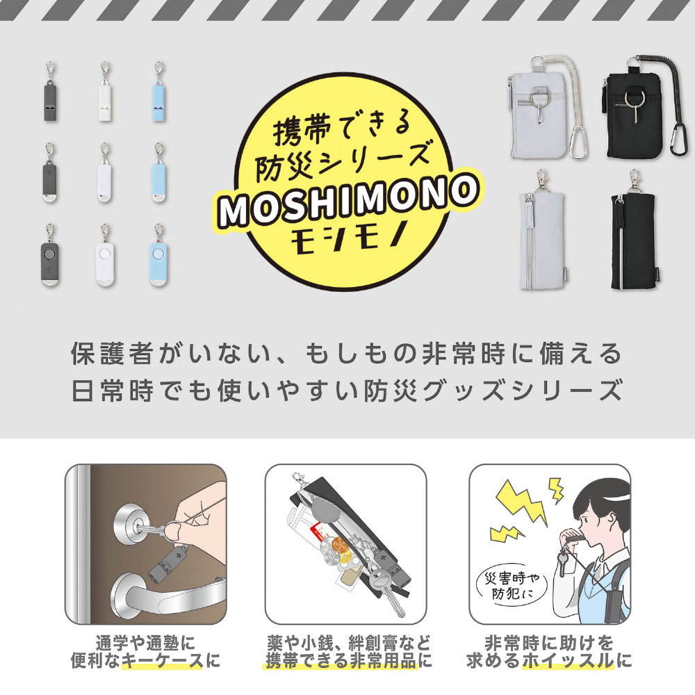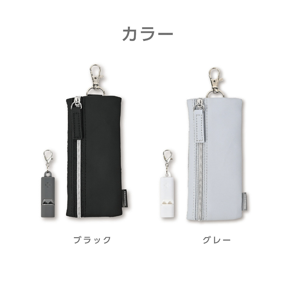 ・非常用品を携帯できるファスナーポケット付 ・雨に強い丈夫な生地、非常用ホイッスル付 ・伸びだるみしにくいリール付 ・長く伸びるリール内蔵でカギを紛失しにくい ・背面に固定ベルト、緊急連絡カード付