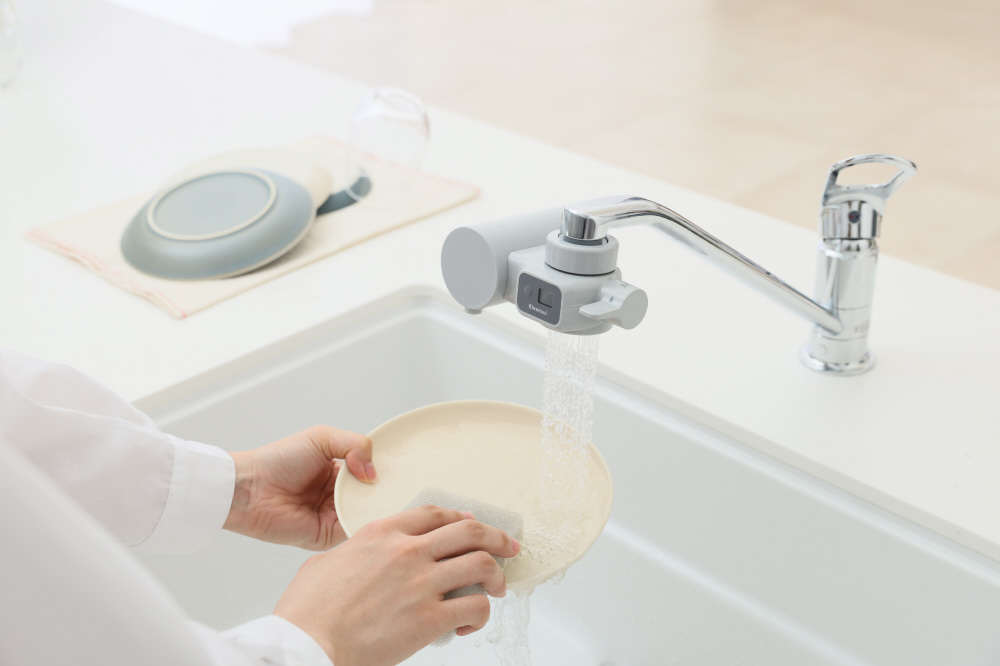 浄水・原水シャワー・原水ストレートの3段階切替で、お皿洗いに便利なシャワーモードは約50%節水。節約を意識したい方に嬉しい機能です。(※当社測定値:呼び13自在水栓、ハンドル開度全開、1分間に16L吐水する状態に当社浄水器を取付けた場合)