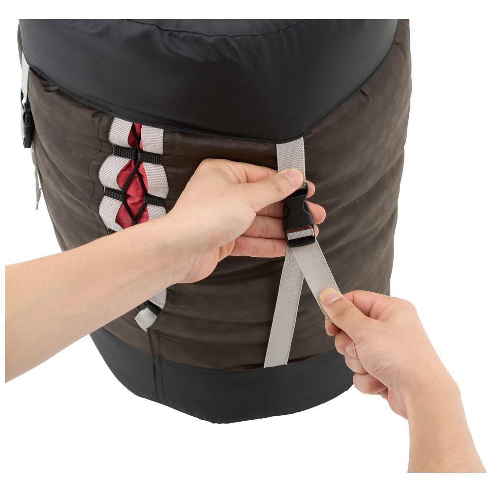 バックルのベルトをさらに締めることで圧縮でき、コンパクトに収納ができます。