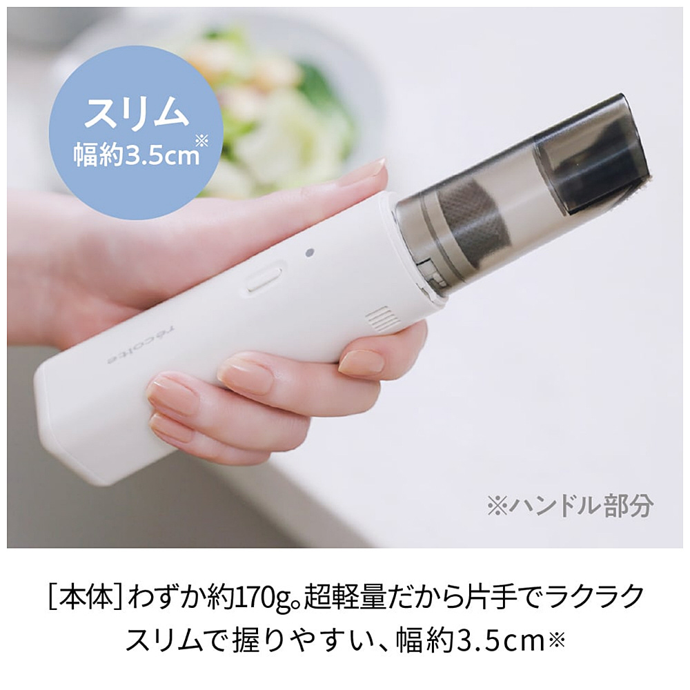 200g と軽量ながら、約2,000Pa(満充電時)とパワフルな吸引力。ホコリや食べかす、冷蔵庫の隅や髪の毛を吸うには十分な吸引力です。