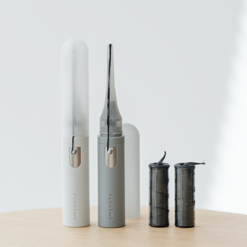 一般的なロールフロスは円盤型ですが、『フロスモ』のフロスは独自の円筒形であることで、コンパクトなペン形状の本体内から糸を引き出してフロスできるしくみを実現しています。