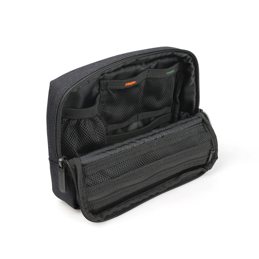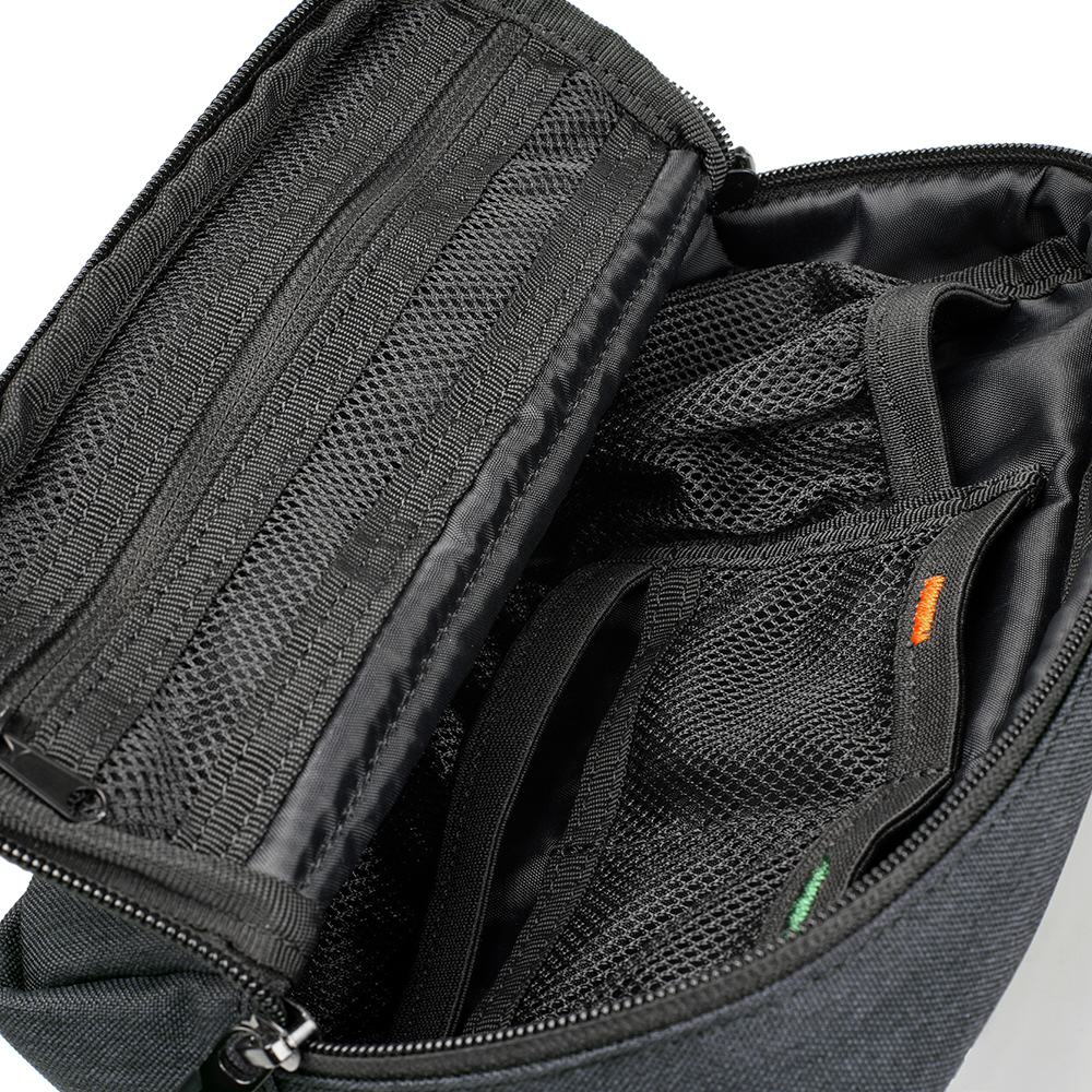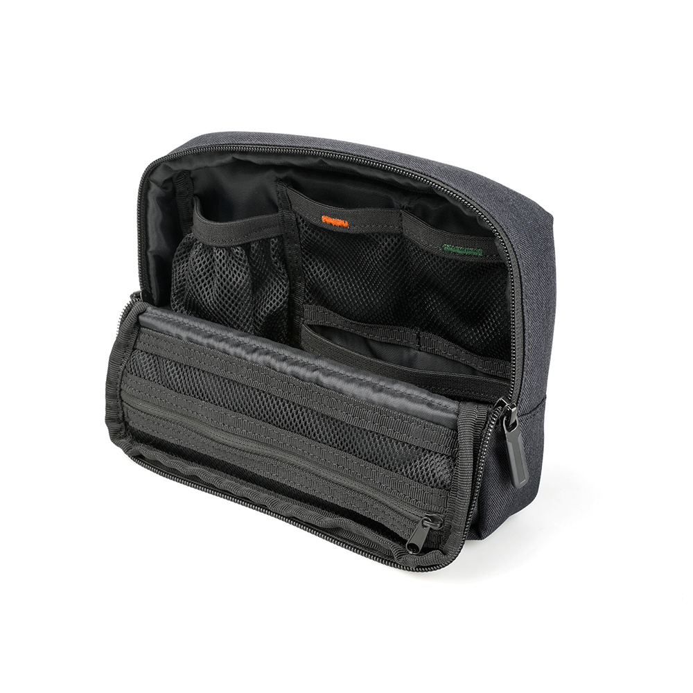 スマートフォンで本格的な撮影を行うときに必要なコンバージョンレンズやミニ三脚、LEDライトなどをまとめて収納することができるマルチガジェットポーチです。内部には細かい仕切りやネット、ゴムが配置されており、収納するものに合わせて自由にレイアウトを決めることができます。どんなシーンにも合わせやすい、スッキリとしたデザインも特長です。