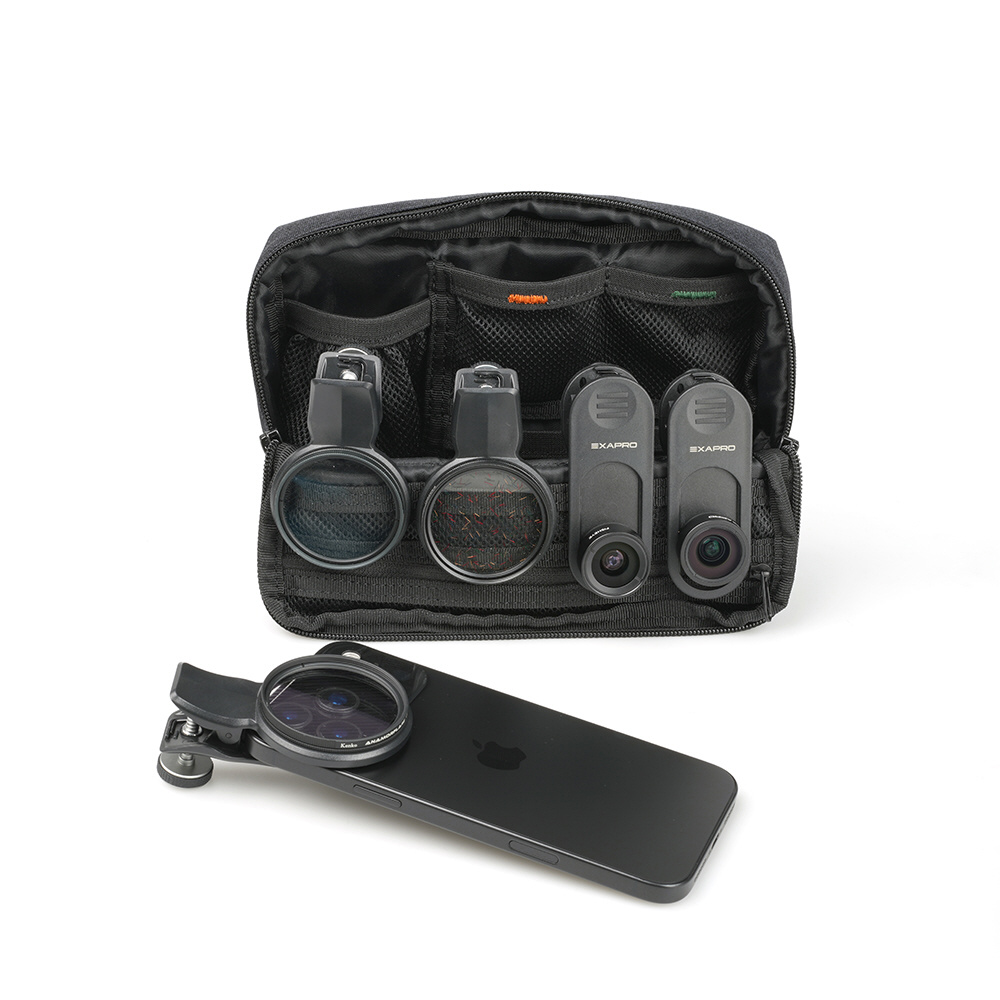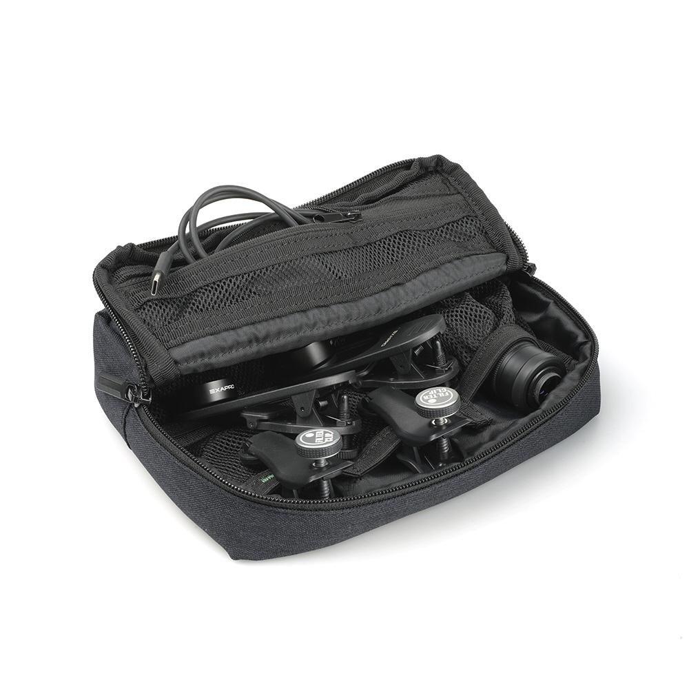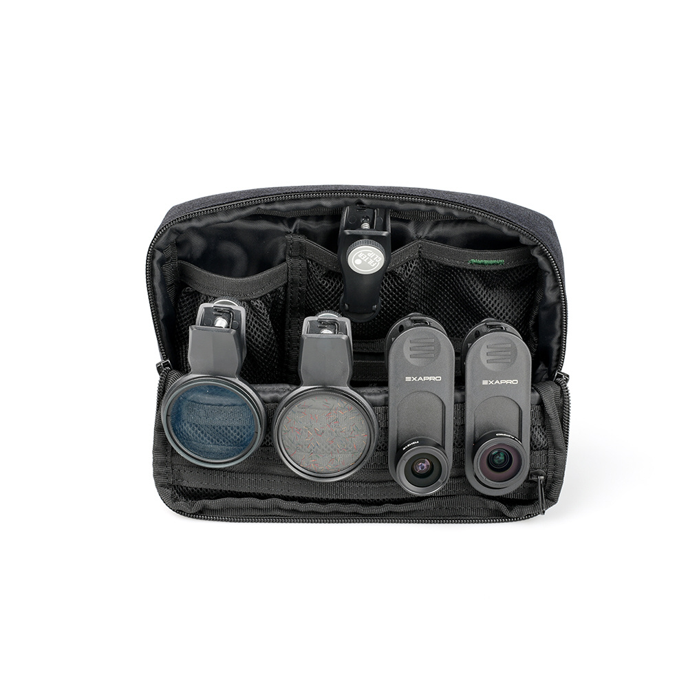 EXAPROシリーズのクリップレンズやフィルタークリップ、マグネティックモバイルスタンドなどを同時に収納可能です。クリップレンズは、ポーチ内部のゴムに引っ掛ける形で安定して収納することができます。