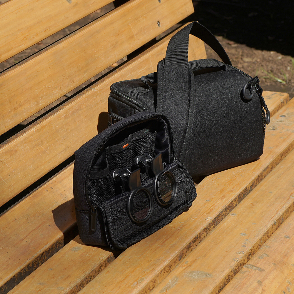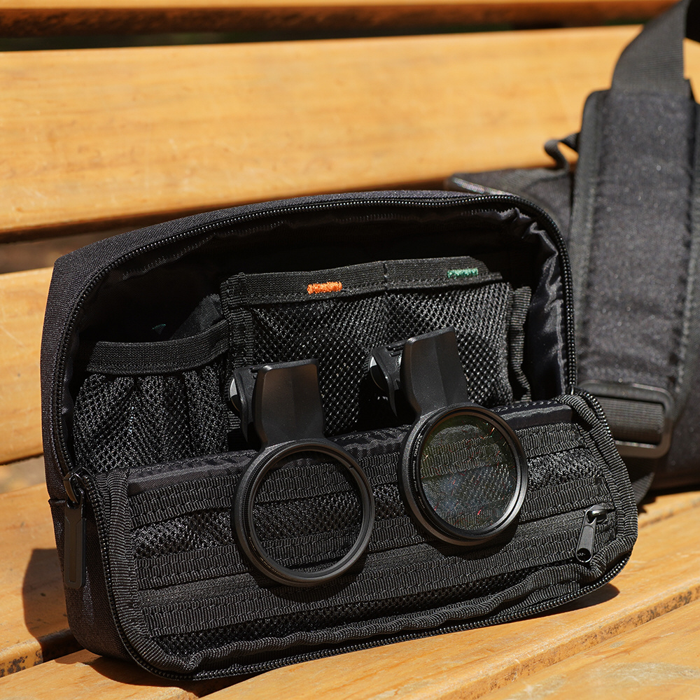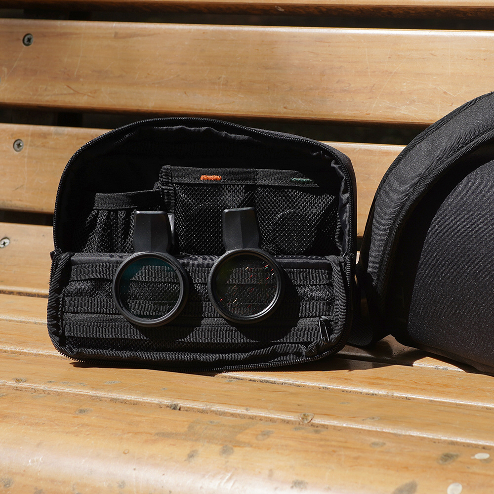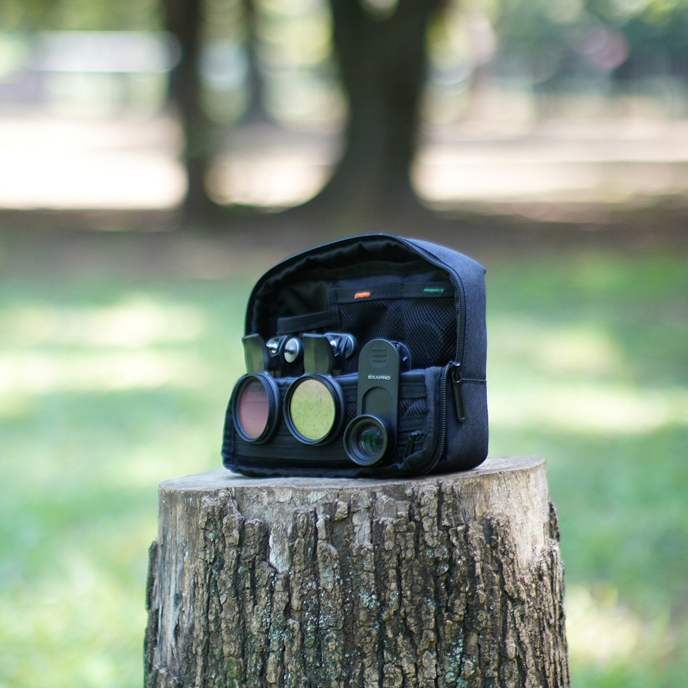 EXAPROシリーズのクリップレンズやフィルタークリップ、マグネティックモバイルスタンドなどを同時に収納可能です。クリップレンズは、ポーチ内部のゴムに引っ掛ける形で安定して収納することができます。