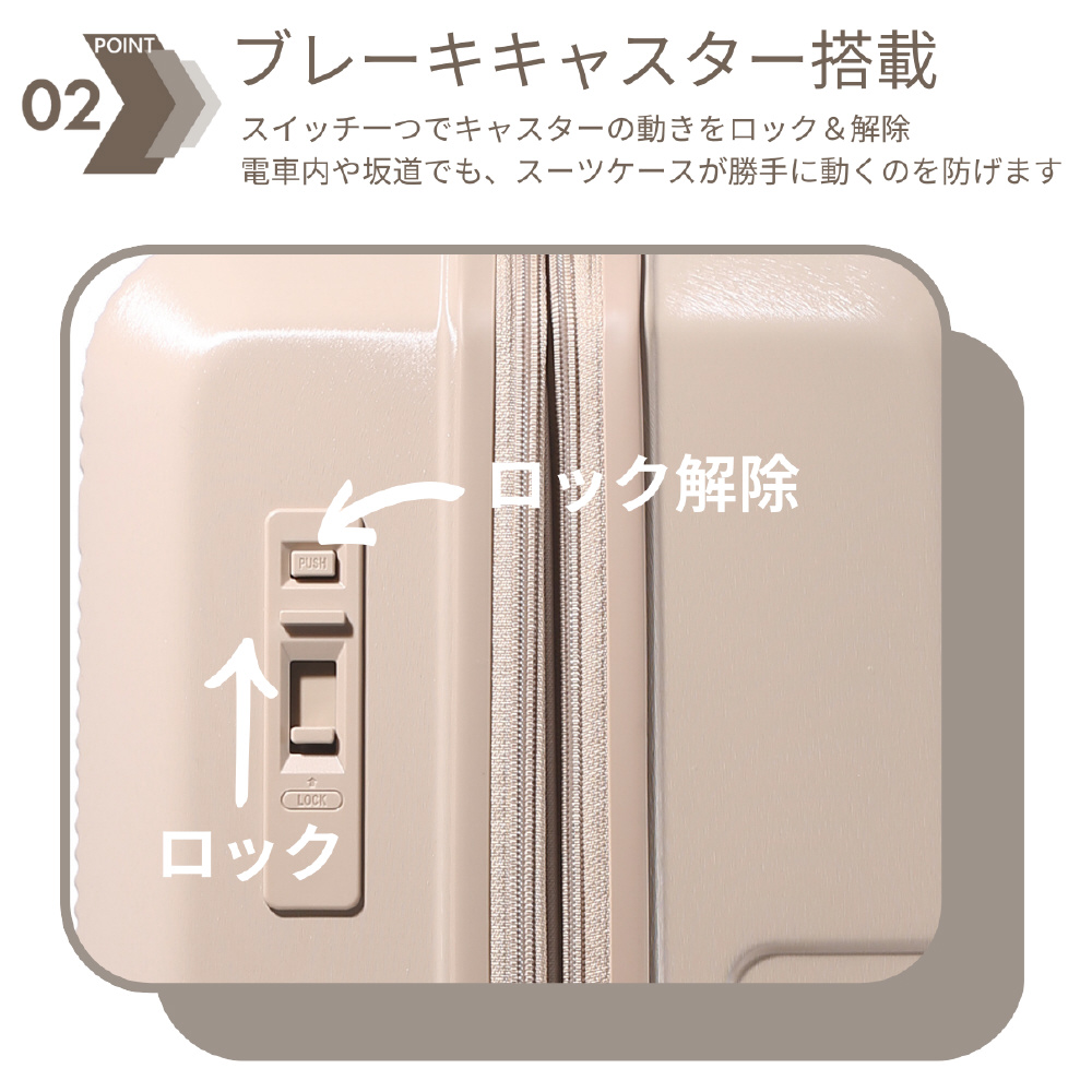 人気のK2スーツケースに、便利なストッパー機能を搭載 ワンタッチストッパーや拡張機能など、使い勝手の良い機能を備えています。キャスターストッパー機能付 軽量×大容量キャリー 無料預け入れ