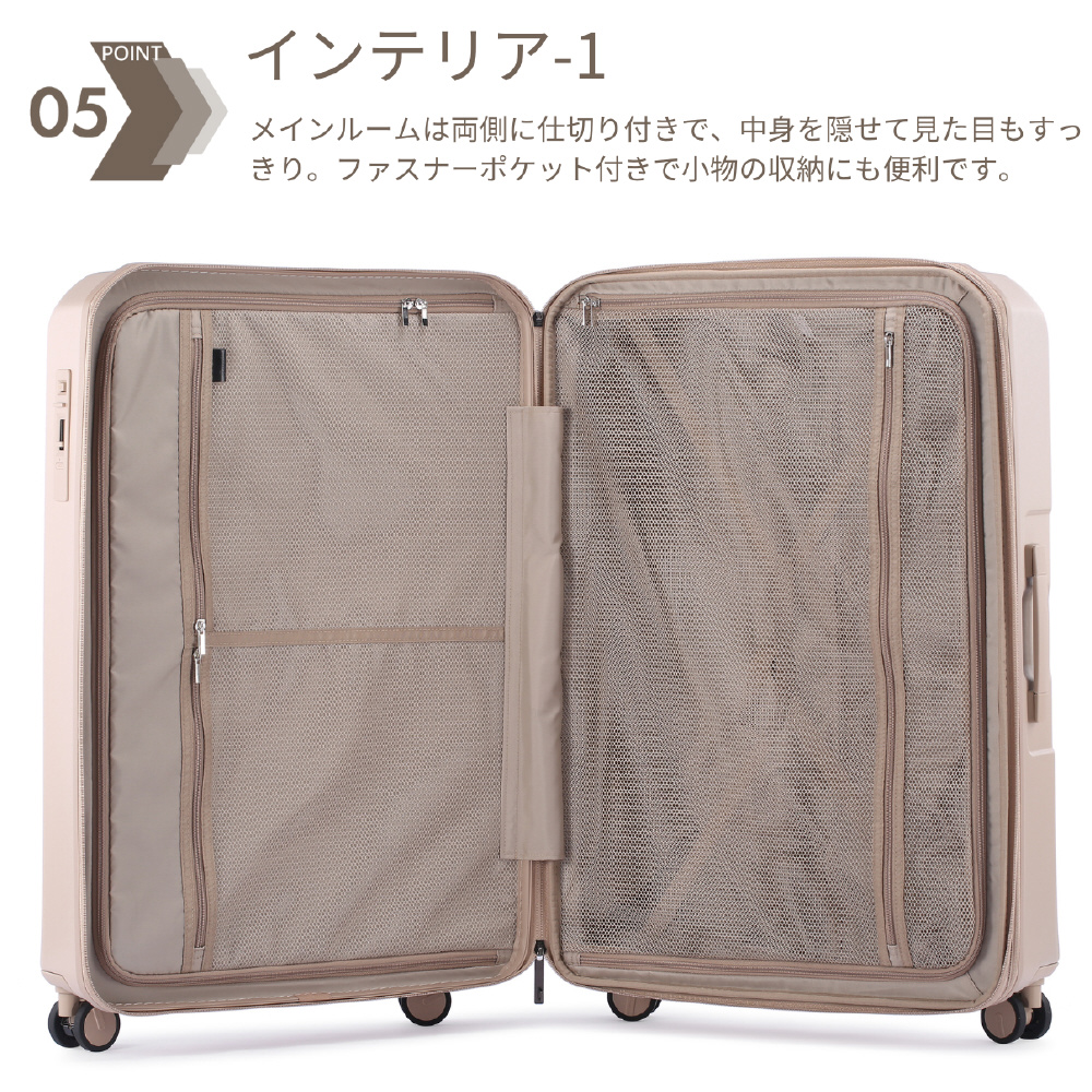 ワンタッチストッパーや拡張機能など、使い勝手の良い機能を備えています。キャスターストッパー機能付 軽量×大容量キャリー 無料預け入れ