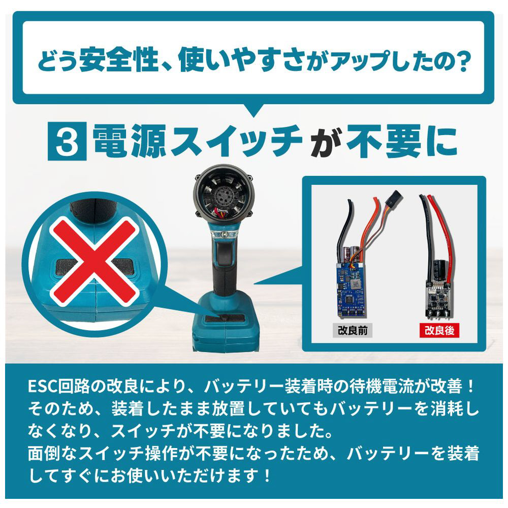 ESC回路の改良により、バッテリー装着時の待機電流が改善!そのため、装着したまま放置していてもバッテリーを消耗しなくなり、スイッチが不要になりました。面倒なスイッチ操作が不要になったため、バッテリーを装着してすぐにお使いいただけます!