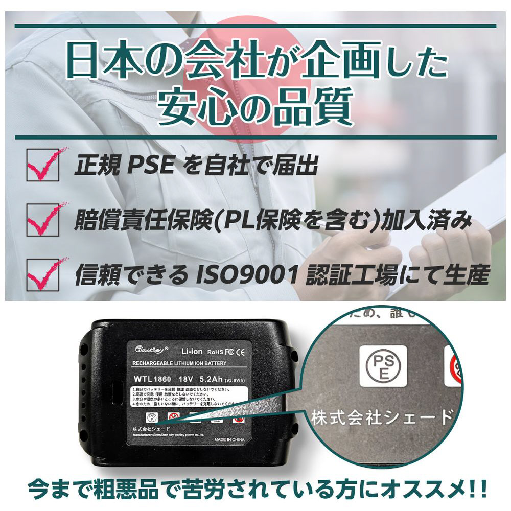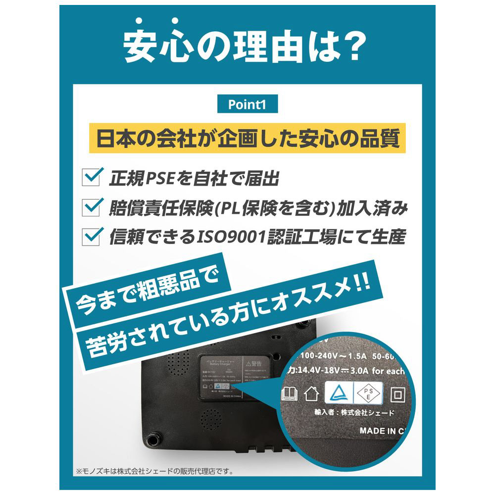 日本の会社が安全性や品質にこだわって企画し、正規のPSEの届け出を自社で行い、ISO9001認証の信頼できる中国工場にて生産しています。