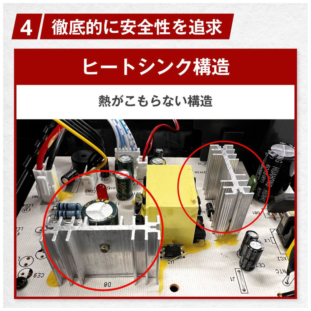 冷却ファンも備え、内部構造はヒートシンク構造と、徹底的に「安全」「あんしん」にこだわりました。