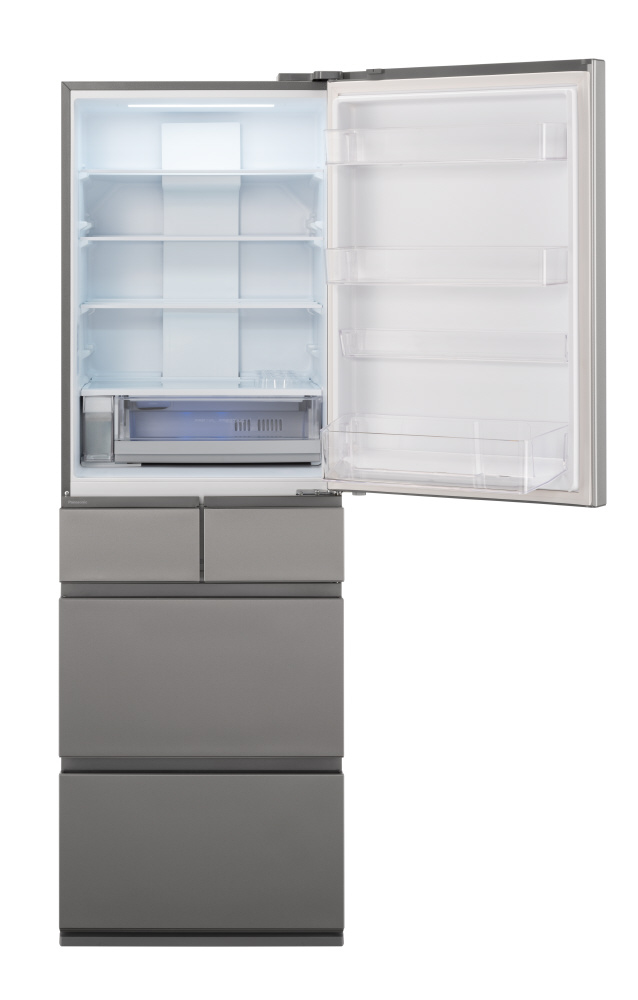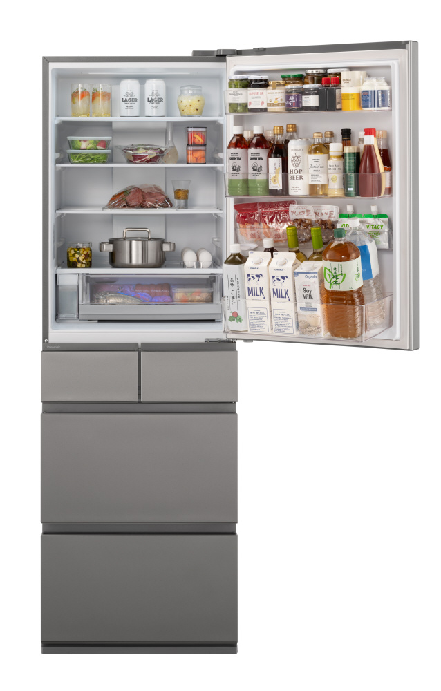 ・冷凍室が93L<60L>(※2)の大容量なのに、「奥まで見えるフルオープン」でケースまるごと引き出せるから、奥まで見えて、取り出しやすい。さらに、深型の上段ケース採用で食品をタテ置き収納できるから、見つけやすく・整理しやすい。