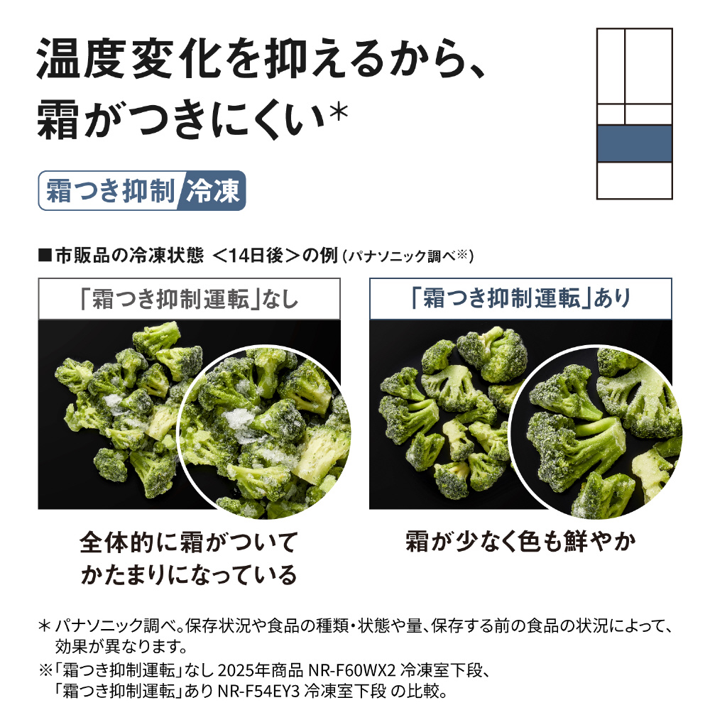 ●霜つき抑制 運転制御 非搭載 2025年商品 NR-F60WX2 冷凍室下段、霜つき抑制 運転制御 搭載 新製品 NR-F54EY3 冷凍室 下段で保存の比較。
