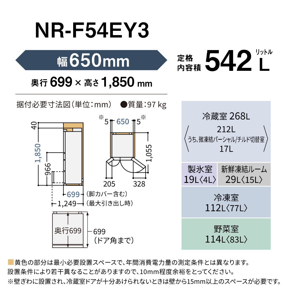※1 2024年商品 NR-F50EX1との比較。NR-F54EY3:幅650mm×奥行699mm、定格内容積542L、2024年商品NR-F50EX1:幅650mm×奥行699mm、定格内容積501L。