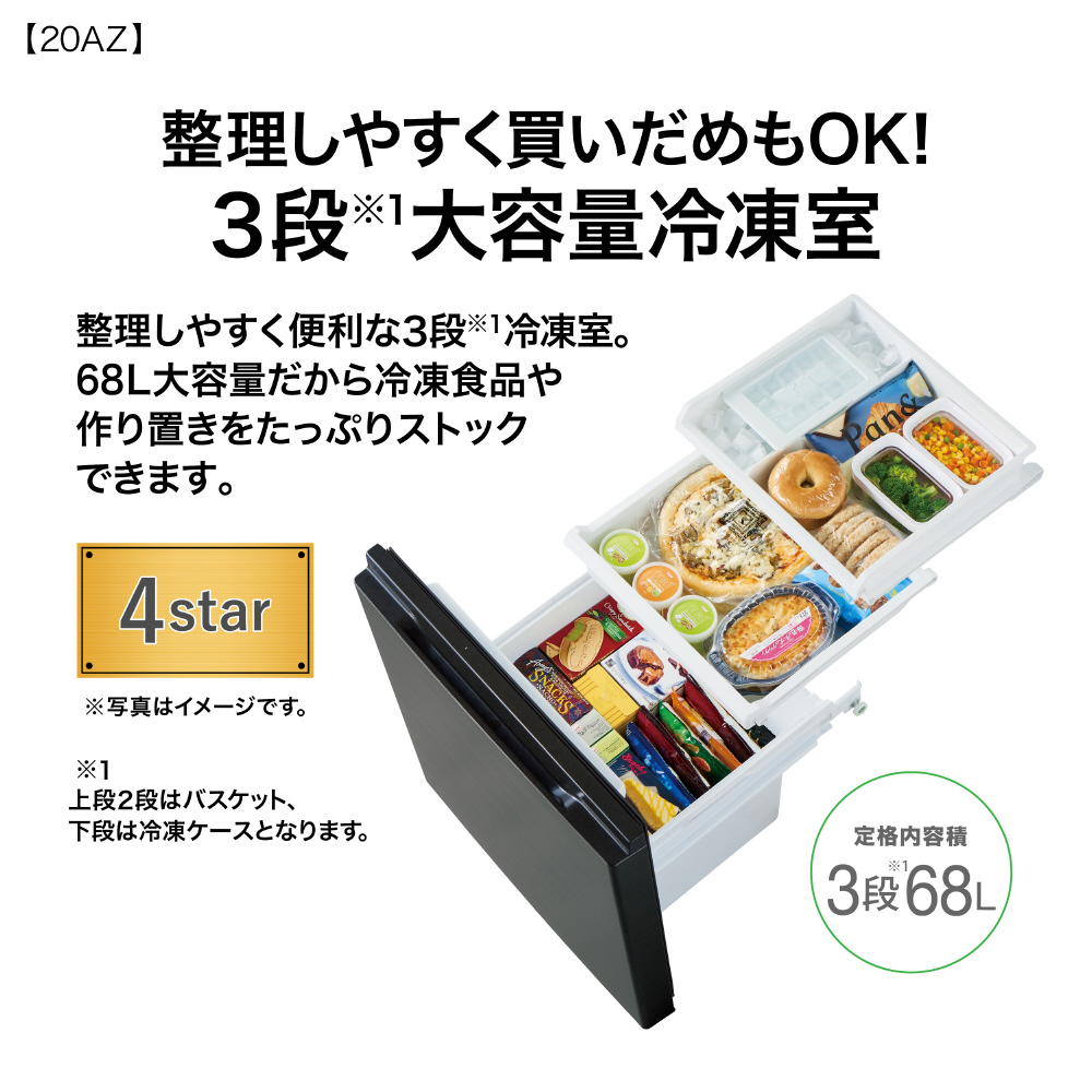 ・大容量68L 3段構造の引き出しタイプの冷凍室