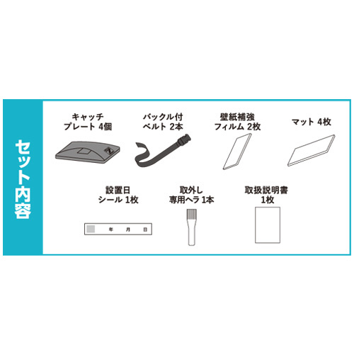 ■耐震マットを壁に貼り付けて固定するため、穴あけ工事は不要です。また工具も一切不要の貼るだけ簡単設置です。