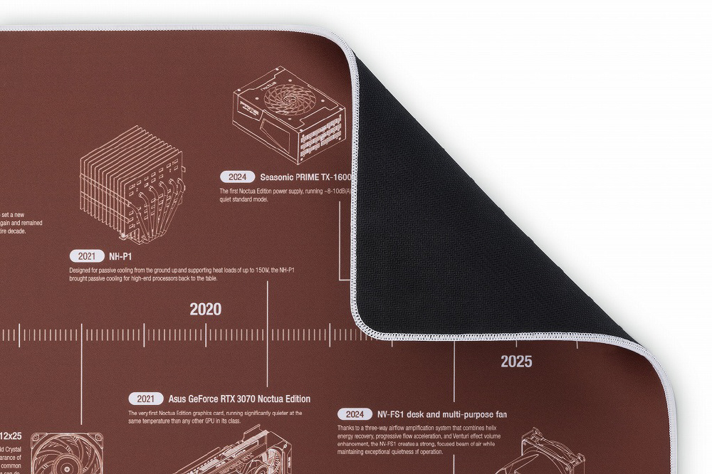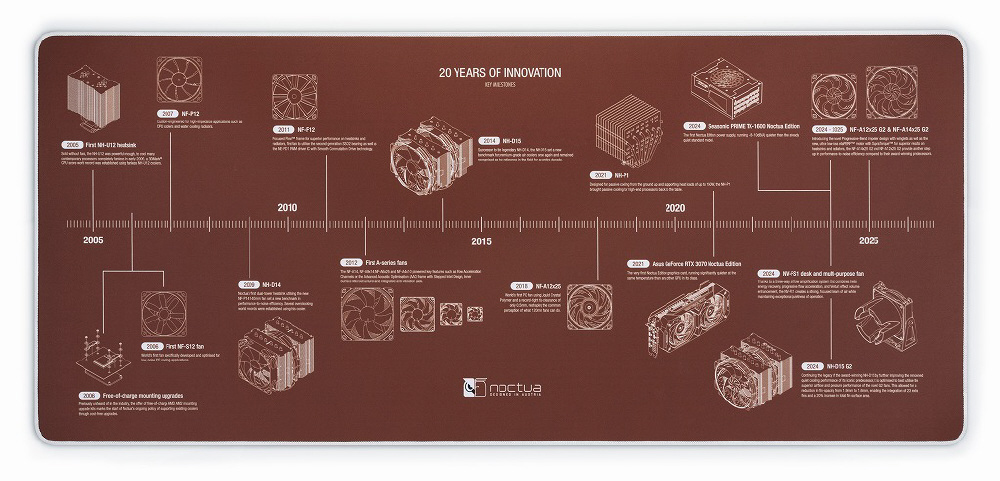 Noctuaの20周年を記念して発行された NP-DM3 は、ブランドの革新の歴史における重要なマイルストーンを記念する高品質のデスクマットです。