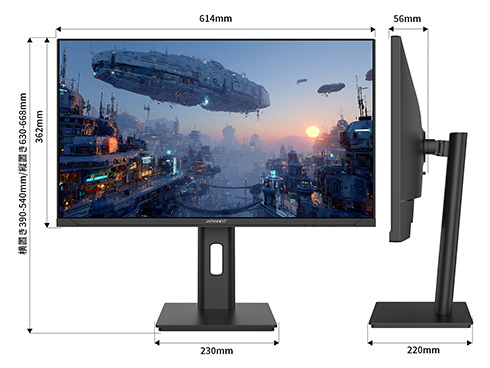 本体サイズ スタンド付:高さ 横置き390-540/縦置き630-668x幅 横置き614/縦置き362x奥行220mm、スタンド幅230mm